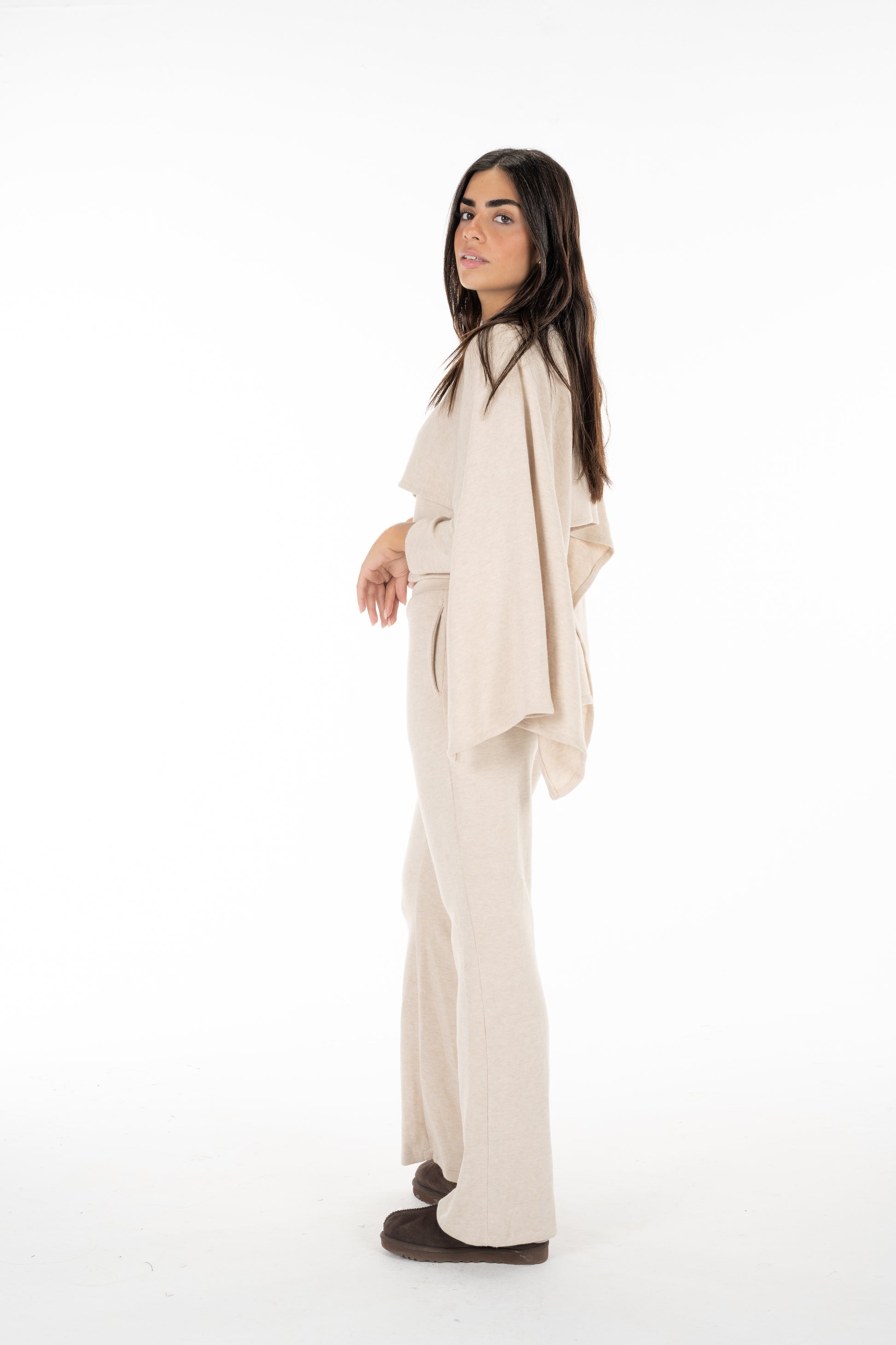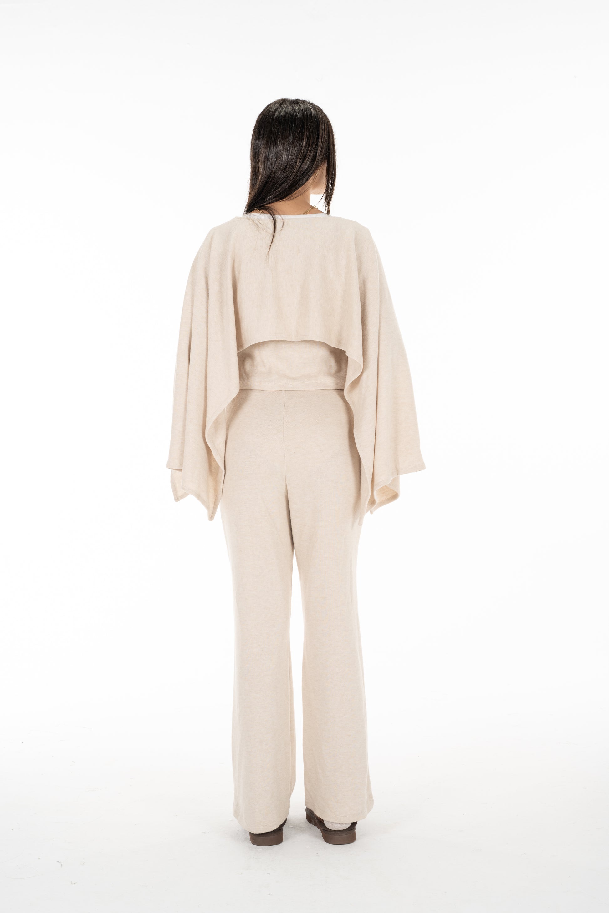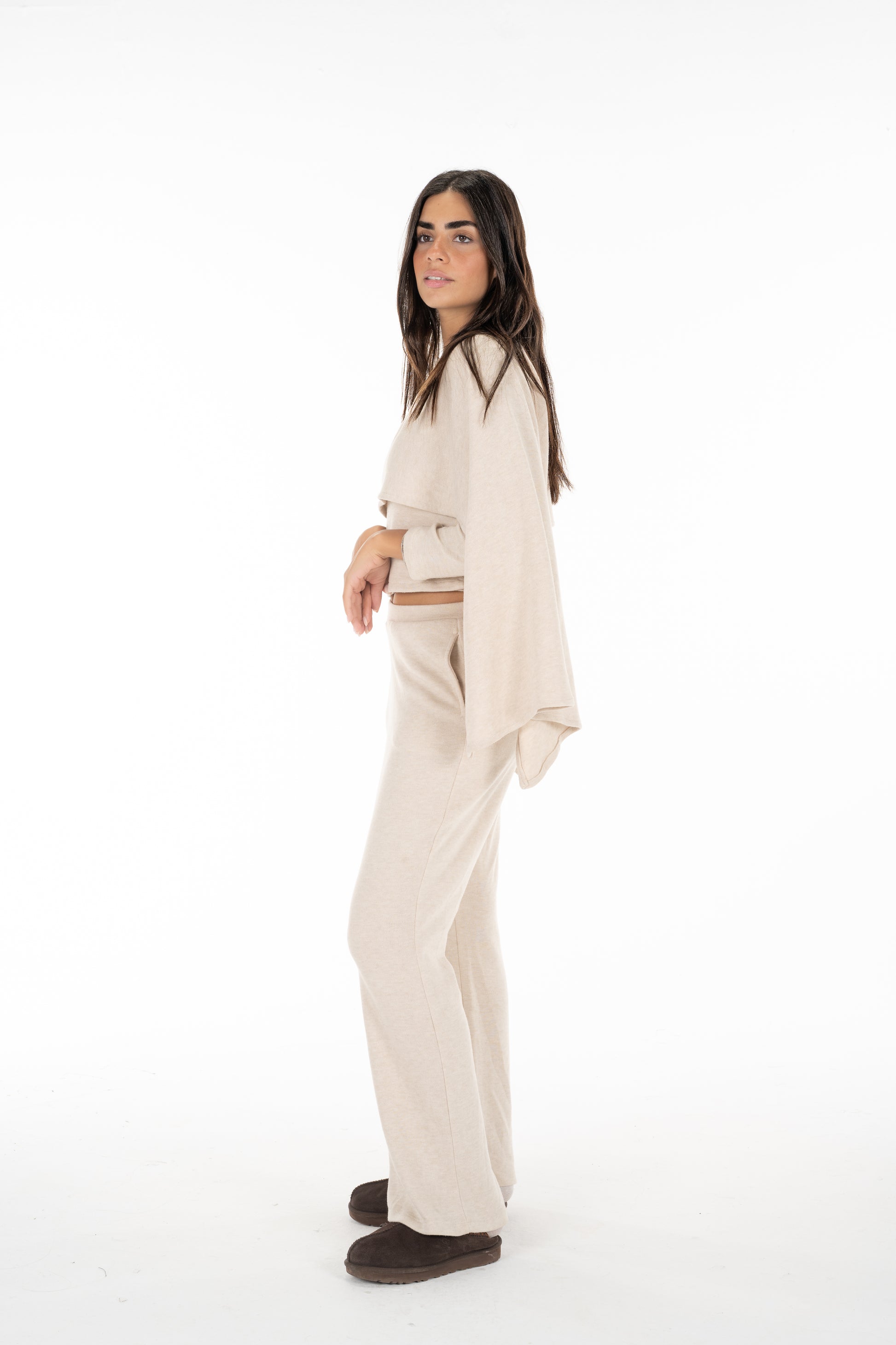 The knitted scarf set. Made from soft knitted fabric, this set includes pants and a long-sleeve top with an attached scarf-like layer that drapes over the chest and sleeves for a chic, layered look. Designed in a versatile beige shade, it’s perfect for lounging, casual outings, or effortless everyday style.