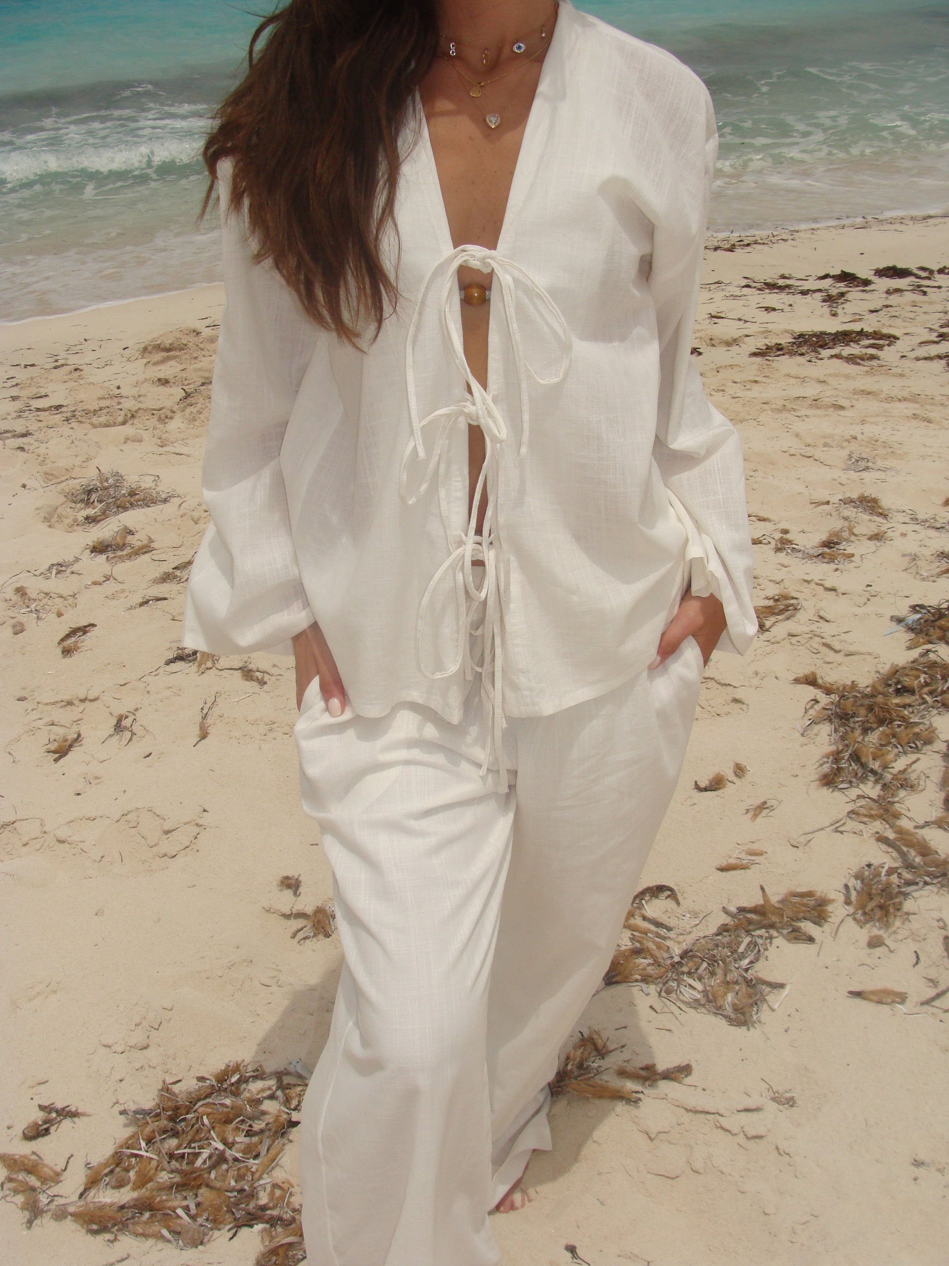The Linen Set – Lightweight, breathable, and made for summer. Features a relaxed-fit long sleeve top with front tie detailing and wide-leg pants designed for all-day comfort. Perfect for slow beach mornings and golden hour strolls.