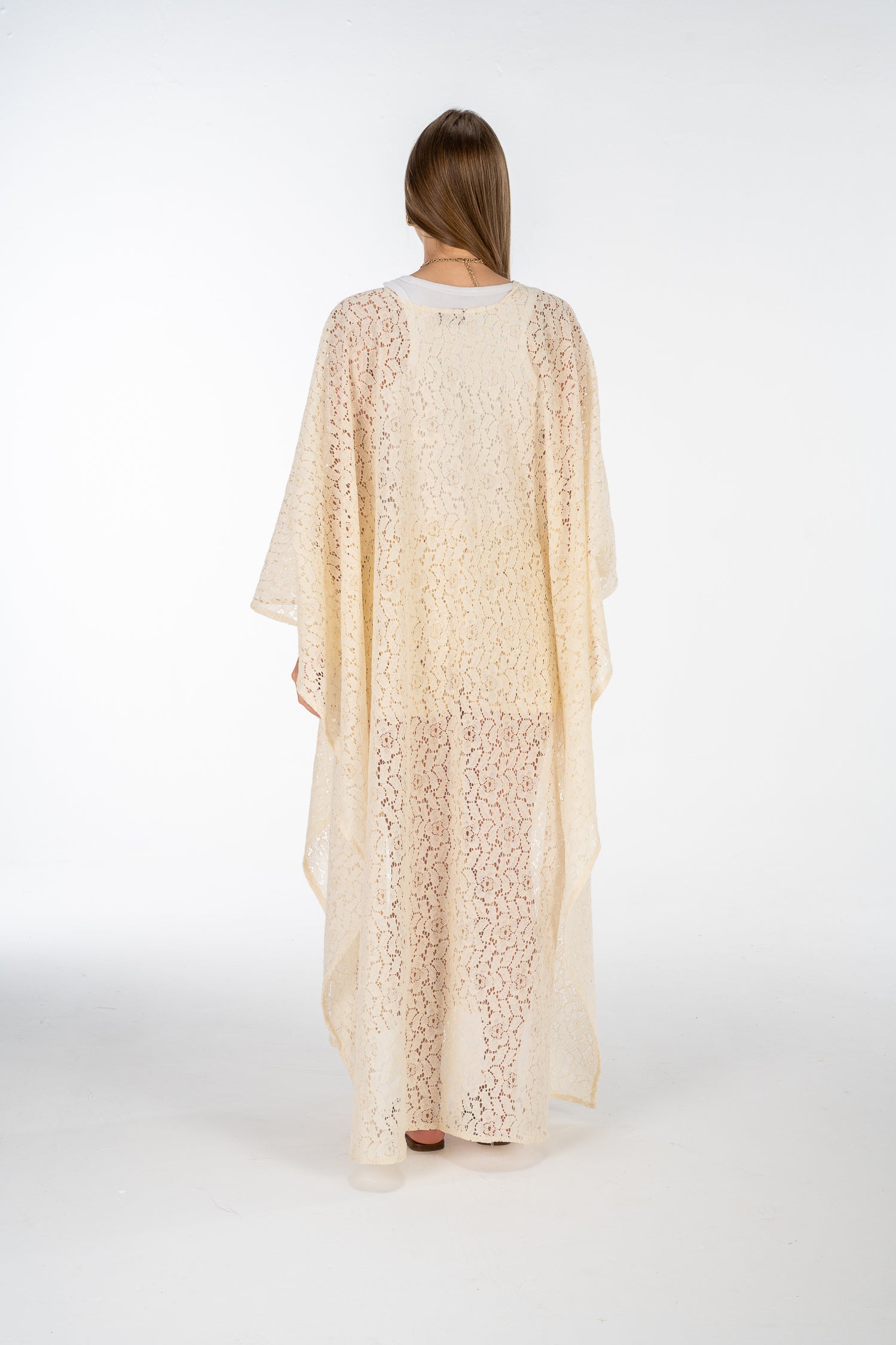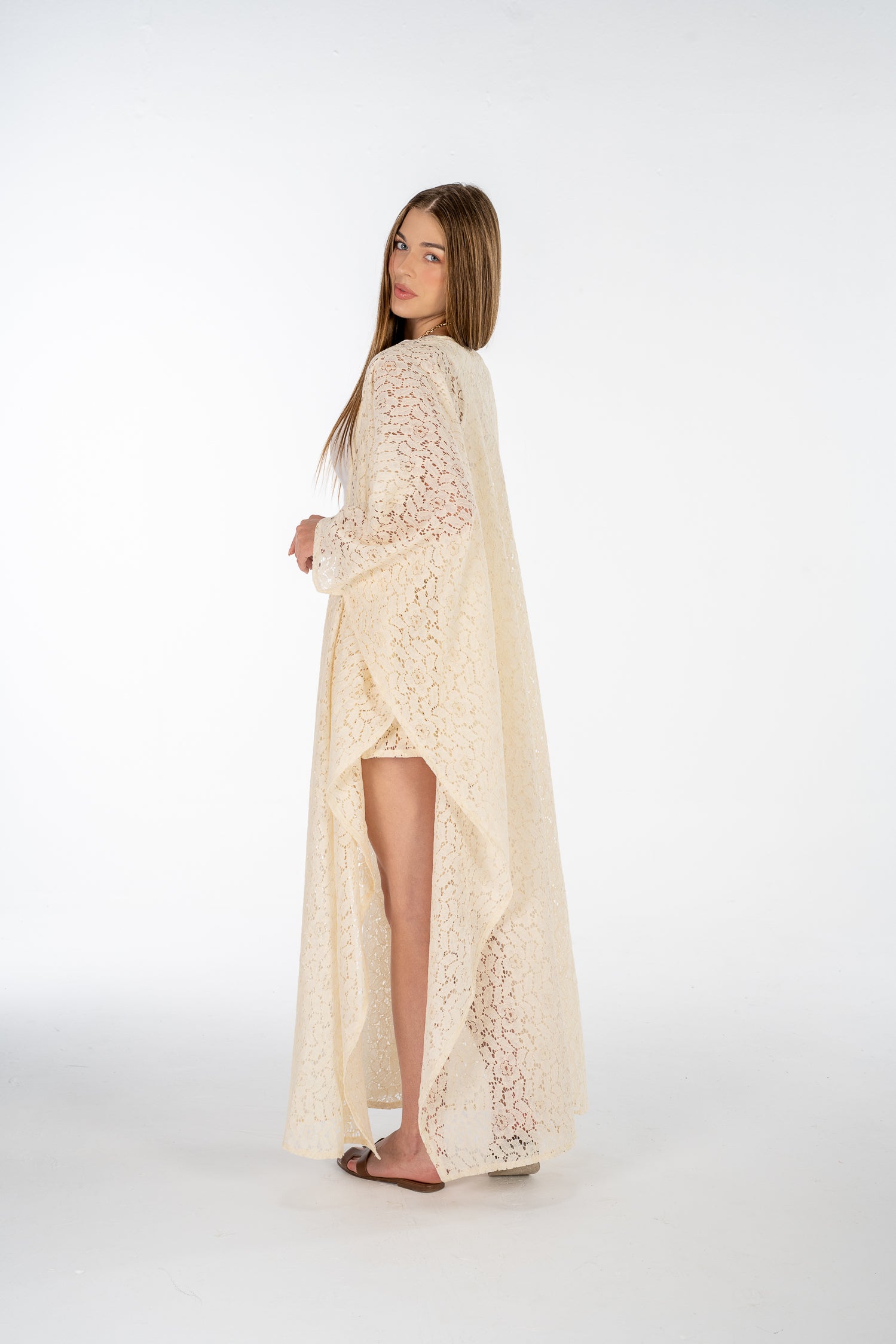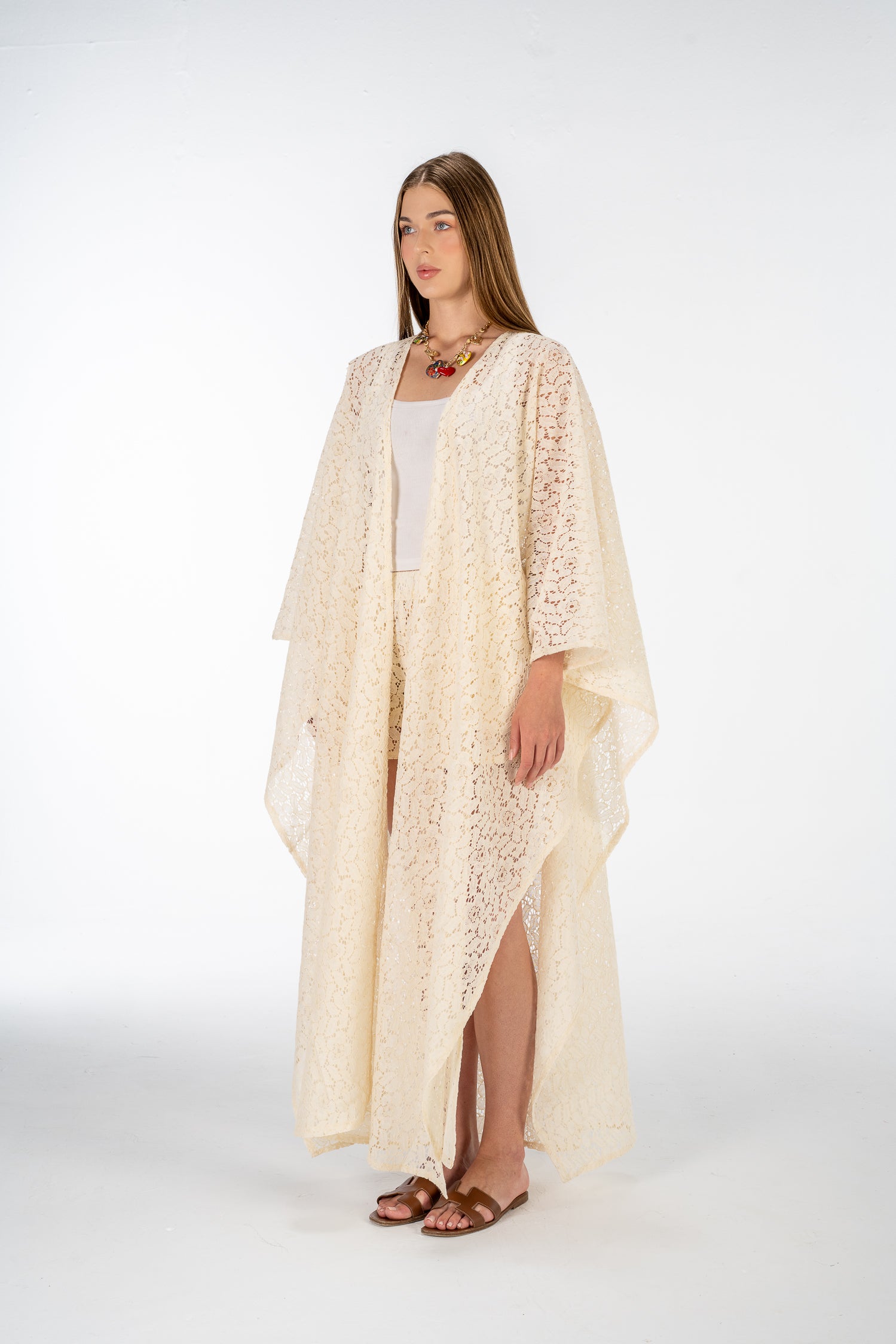 A lightweight two-piece lace set featuring a long sheer kimono and matching high-waisted shorts. Designed for effortless layering — perfect over swimwear or styled for beachside evenings.
