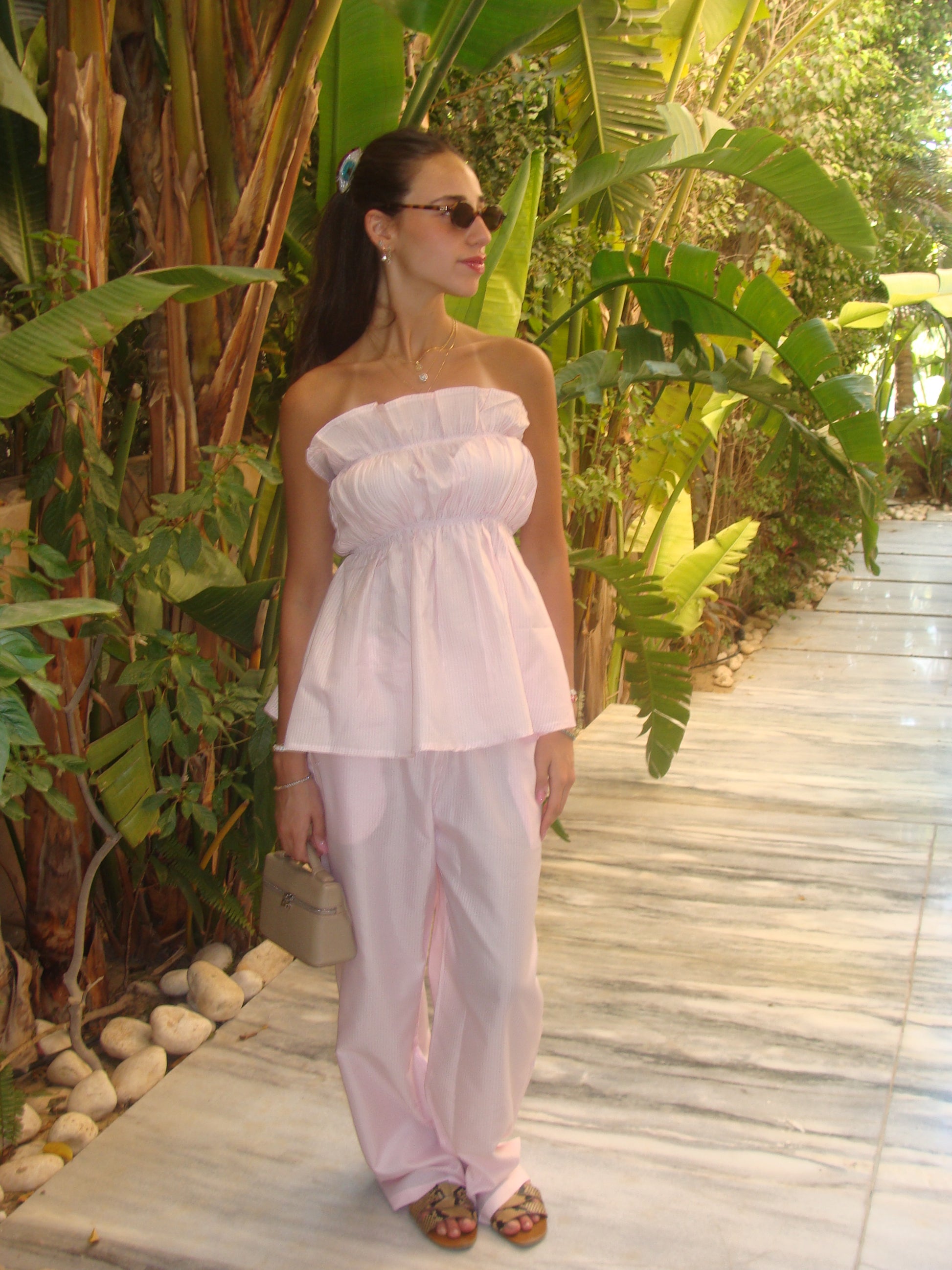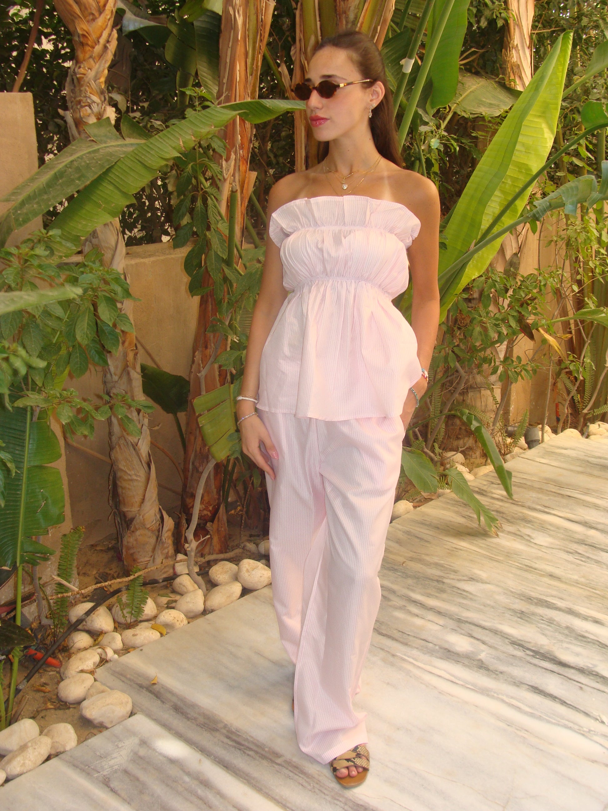 Strapless ruched top paired with relaxed wide-leg pants. Light, breathable, and effortlessly flattering.