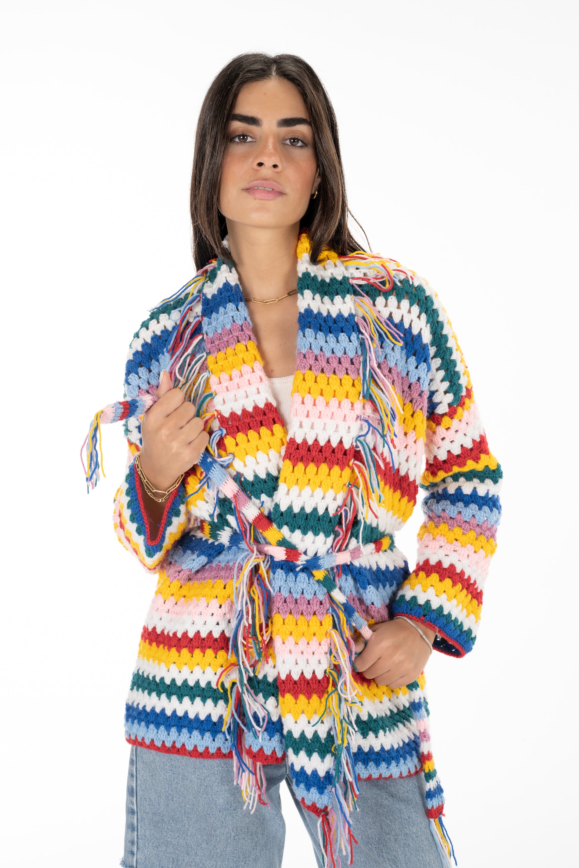 This Handmade Crochet Cardigan is crafted entirely by hand with vibrant, colorful yarns. The fully crocheted design gives it a unique, artisanal look, making it a standout piece for any outfit. Comfortable, stylish, and full of character, it’s perfect for adding a playful, creative touch to your wardrobe.